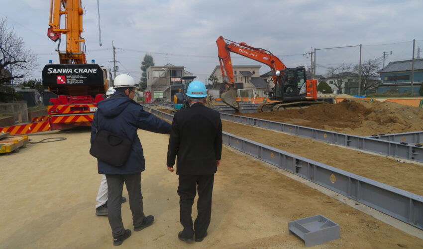 今回は、仮設校舎基礎工事と、屋内運動場床ライン仕上げの現場に立ち会っていただきました。
